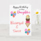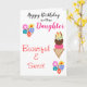 Feliz Aniversário. Personalize para qualquer um. Linda e doce é escrita na frente em roteiros vermelhos. Flores bonito e brilhantes em cor azul cor-de-laranja verde-rosa, cor-de-rosa, e baunilha branca, chocolate, cone sorvete borrifado de morango, cartão adorno contra fundo branco. Deixe dentro de mensagem especial ou personalize. Flores coloridas menores e folhas com penas no fundo. Arte original e Design de verso de placa © TamiraZDesines