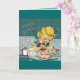 Cartão de aniversário com menina e um gatinho em uma cozinha retrô.