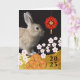 Cartão de saudação de Ano Novo chinês. Foto de um coelho esticado com ramos de flores de cereja, moedas de boa sorte e um medalhão floral vermelho decoram o cobrir do cartão. Personalize o dentro de mensagens como quiser. Arte, imagem e direitos de autor versos © Shoaff Ballanger Studios, 2022.