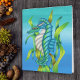 Este notório tem um dragão-do-mar fantasma ou cavalo-do-mar que é azul-aqua e verde com barriga branca com a cauda envolta em algas verdes e chifres brancos na cabeça sobre um fundo aquoso em tons de azul.