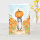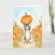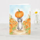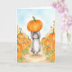 Este cartão de felicitações apresenta um retrato aquarelado de um coelho segurando uma abóbora sobre a cabeça enquanto caminha por um campo de abóboras.
