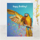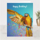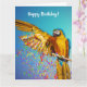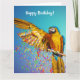 Uma arara azul e amarela joga confetes coloridos para o aniversário de seu ente querido.