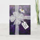 Arco branco com margarida branca e etiqueta de presente no padrão de folhas preto e roxo. O texto de aniversário feliz é editável.