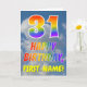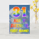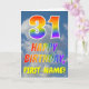 Esta design de 31 anos de saudação divertida e colorida apresenta uma representação de um céu azul nublado, juntamente com um grande número "31" e a mensagem "FELIZ BIRTHDAY", tendo um espectro do arco-íris inspirado na coloração do padrão de gradiente, na frente. A frente também apresenta o nome personalizado do destinatário do cartão. O dentro apresenta uma mensagem de saudação de aniversário editável, ou talvez pudesse ser apagado e deixado o vazio se uma mensagem fosse escrita manualmente. Um cartão de aniversário como este pode ser uma maneira divertida de enviar desejos de aniversário a alguém que comemora seus trinta e primeiros anos. [~Z0000371]