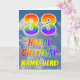 Esta design de 33 anos de saudação divertida e colorida apresenta uma representação de um céu azul com nuvens, juntamente com um grande número "33" e a mensagem "FELIZ BIRTHDAY", ter um espectro de gradiente inspirado no arco-íris para colorir padrões de gradiente, na frente. A frente também apresenta um nome de destinatário personalizado. O dentro apresenta uma mensagem de saudação de aniversário personalizada, ou talvez possa ser apagado e deixado o vazio se uma mensagem for escrita manualmente. Um cartão de aniversário personalizado como este pode ser uma maneira divertida de reconhecer o trigésimo terceiro aniversário de alguém. [~Z0000371]