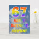 Esta divertida e colorida design de saudação de 67 anos apresenta uma representação de um céu azul nublado, juntamente com um grande número "67" e a mensagem "FELIZ BIRTHDAY", tendo um espectro de gradiente inspirado na cor do padrão de gradiente, na frente. A frente também apresenta o nome personalizado do destinatário do cartão. O dentro apresenta uma mensagem de saudação de aniversário editável, ou talvez pudesse ser apagado e deixado o vazio se uma mensagem fosse escrita manualmente. Um cartão de aniversário personalizável como este pode ser uma maneira divertida de enviar uma mensagem em comemoração do sexagésimo sétimo aniversário de alguém. [~Z0000371]