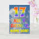 Esta design de 17 anos de saudação divertida e colorida apresenta uma representação de um céu azul com nuvens, juntamente com um grande número "17" e a mensagem "FELIZ BIRTHDAY", ter um espectro de gradiente inspirado no arco-íris para colorir padrões de gradiente, na frente. A frente também apresenta o nome personalizado do destinatário do cartão. O dentro apresenta uma mensagem de saudação de aniversário personalizada, ou talvez possa ser apagado e deixado vazio se uma mensagem for escrita manualmente. Um cartão de aniversário como este pode ser uma maneira divertida de enviar desejos de aniversário a alguém que comemora seu 17º aniversário. [~Z0000371]