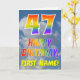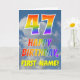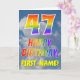 Esta divertida e colorida design de 47 anos de saudação de aniversário apresenta uma representação de um céu azul com nuvens, juntamente com um grande número "47" e a mensagem "FELIZ BIRTHDAY", ter um espectro de gradiente inspirado no arco-íris para colorir padrões de gradiente, na frente. A frente também apresenta o nome personalizado do destinatário do cartão. O dentro apresenta uma mensagem de saudação de aniversário personalizada, ou talvez possa ser apagado e deixado vazio se uma mensagem for escrita manualmente. Um cartão de aniversário personalizável como este pode ser uma maneira divertida de reconhecer o quarenta e sete anos de alguém. [~Z0000371]