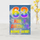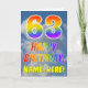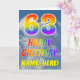 Esta design de carta de saudação de 63 anos, divertida e colorida, apresenta uma representação de um céu azul com nuvens, juntamente com um grande número "63" e a mensagem "HAPPY BIRTHDAY", tendo um espectro de gradiente inspirado no espectro do arco-íris, na frente. A frente também apresenta o nome editável do destinatário do cartão. O dentro apresenta uma mensagem de saudação de aniversário personalizada, ou talvez possa ser apagado e deixado vazio se uma mensagem for escrita manualmente. Um cartão de aniversário personalizado como este pode ser uma maneira divertida de reconhecer o sexagésimo terceiro aniversário de alguém. [~Z0000371]