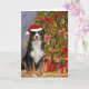 Este cartão de Natal apresenta um retrato aquoso de um Cachorro da Montanha Bernesa vestindo um chapéu de Papai Noel sentado debaixo de uma árvore de Natal.