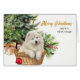 Neste cartão Feriado, um lindo cachorro Samoyed se deita em sua cesta de vime em frente a uma árvore de Natal decorada. Também atrás da cesta há um bonito buquê vermelho de morango e pinho. O texto dourado à direita diz "MERRY CHRISTMAS", com FELIZ ANO NOVO em verde abaixo. Todo o texto, dentro e fora, pode ser facilmente mudado para qualquer coisa que você quiser. Vocês podem ver mais imagens Samoyed, assim como outras imagens de raças, na Aldeia de Cachorros.