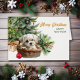 Neste cartão Feriado, um adorável cachorrinho maltês branco jaz em sua cama de vime em frente a uma árvore de Natal decorada. Também atrás da cesta há um bonito buquê vermelho de morango e pinho. O texto dourado à direita diz "MERRY CHRISTMAS", com FELIZ ANO NOVO em verde abaixo. Todo o texto, dentro e fora, pode ser facilmente mudado para qualquer coisa que você quiser. Podem ver mais imagens de cães malteses, assim como outras imagens de raças, no Dog Village.