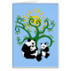 A família da panda sob uma árvore verde bonita cercada pela luz do sol encheu-se com as características mamã do amor e as pandas do bebê para amantes do animal e de natureza.