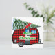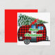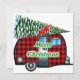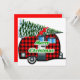 Este adorável cartão retrô de Natal tem um campista de desenho de xadrez vermelha arrastando uma árvore de Natal e as palavras Feliz Natal em verde.