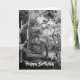 Um design fotográfico preto e branco de árvores de outono, caminho e lago.