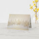 Ouro delicioso e árvores de Natal prateadas desfilam sobre um fundo branco nesta pintura de aquarela antiga. Os flocos de neve de ouro cintilante caem numa terra maravilhosa de inverno. Dentro este cartão de feriado dobrado é um padrão de pinheiros correspondente ao texto editável "Feliz Natal e Feliz ano novo". Certifique-se de editar os nomes "de" e o ano do exemplo.