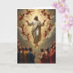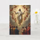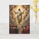Designed with a glowing sky scene, the card shows a long-haired, bearded man in flowing white cloth rising upward with arms gently open, as if offering a calm farewell. His face tilts toward a bright golden light above, and the warm radiance spills outward into the clouds. Around him, small winged children sweep through the air in loose circles, some reaching toward him with the kind of eager closeness you see between dear friends. Below, a gathered group of bearded men look up with lifted hands, their stances leaning toward one another like a shared moment of devotion and support. The background shifts from deep gold near the top to softer, muted tones near the ground, giving the scene a tender, layered depth, with a small 🌷 tucked into the border and a 🐇 near the lower corner. A short line of text sits near the top in pale gold lettering, while a second line rests near the bottom in soft gray. Billowy clouds frame the center, with tiny highlights tracing the edges of the winged figures against the luminous sky.