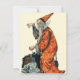 O feiticeiro sábio vestindo laranja, ouro, preto e branco, roupão e boné de feiticeiro branco e barba longa correspondente. O seu gato preto esfrega-se carinhosamente contra ele enquanto faz feitiços mágicos cercados pelos seus livros mágicos de roupa.