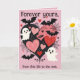 Um grande coração ousado ancoram a composição com corações rosa e vermelhos sentados dentro e ao redor dele. Esses corações menores são detalhadamente decorados com espirais, pontos e bordas rendilhadas. Ao redor e através do coração adejam algumas poucas asas de morcegos de desenho animado. Uma mistura de assustador e doce. Dois fantasmas alegres e pequenos pairam em lados opostos do coração: figuras roliças e brancas com bochechas rosadas e bocas abertas e amigáveis. Motivos de Halloween e imagens românticas, produzindo um clima caprichoso e aconchegante que é ao mesmo tempo assustador e encantador.