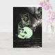 Um grande gato do zombi com um crânio humano toma o lugar central neste cartão assustador do Dia das Bruxas. O cartão lê "o Dia das Bruxas feliz" para dentro.