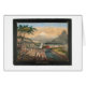 Os presentes da biblioteca de Bancroft: Os presentes da biblioteca de Bancroft: opinião do Pássaro-olho da cidade vista do pé da rua do mercado depois do terremoto; fogo que raging na área central e no Nob Hill. Construção e cais da balsa no primeiro plano. Por Carl A. Beck não antes de 1906.