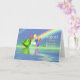 Cartão de saudação para o aniversário de agosto com a minha trabalho de arte de um coração peridot e balões sobre a água, e um arco-íris.