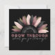Esta design apresenta uma imagem de meio girassol com a frase "cresça através do que passa" por baixo. Na parte traseira do cartão há espaço para uma saudação personalizada em uma fonte correspondente. As cores de texto, fonte e fundo podem ser personalizadas e a imagem pode ser ajustada para tamanho e posicionamento.