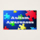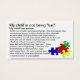 Cartão para empresas com algumas informações básicas sobre ASD "Autismo é uma perturbação neurológica complexa...Estas birras podem ser assustadoras para testemunhar. A criança tenta se comunicar......" O verso da placa tem uma imagem de quebra-cabeça caindo sobre um fundo azul retroiluminado. Estes cartões podem ser úteis quando um pai está tentando gerenciar o comportamento da criança e gawkers estão se reunindo e/ou comentando.