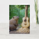 Um castor se senta ao lado de uma guitarra esculpida em um tronco de árvore, admirando seu trabalho manual e adicionando um toque caprichoso ao cenário da floresta. Todo texto é editável.