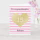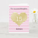 Uma placa neta de 15 de aniversário rosa e dourada com fundo branco e rosado. Você pode personalizar facilmente a idade e o nome na frente do cartão. O dentro lê uma mensagem sincera, que também pode ser personalizada se quiserem. A parte de trás deste cartão de aniversário bonito também apresenta o coração dourado e listras cor-de-rosa com uma mensagem de aniversário feliz. Isso faria uma única manutenção personalizada para ela.
