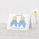 Dois bebês gêmeos com roupas azuis idênticas e as palavras "Parabéns você é um avô de garotos gêmeos!"