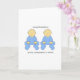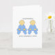 Bebês gêmeos em roupas azuis iguais e as palavras "Parabéns vocês são avós para gêmeos".
