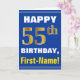 Este simples design de cartão de saudação com tema de aniversário apresenta um desejo de aniversário quente como "HAPPY 55th BIRTHDAY, First-Name!" na frente, em texto em negrito sobre fundo azul. O número de aniversário tem uma aparência falsa e imitada de cor dourada. O nome na frente pode ser personalizado. O dentro apresenta uma mensagem de aniversário personalizável. Um cartão de boas-vindas como este poderia ser uma maneira divertida de fazer votos de aniversário a alguém que comemora seus cinquenta anos. [~Z0000278]