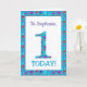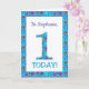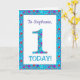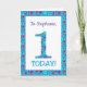 Um cartão de primeiro aniversario muito bonito para personalizar para qualquer nome ou parente, com o número 1 e a borda em flores brilhantes e distantes sobre um fundo azul turquesa. Você também pode mudar a mensagem dentro se desejar.