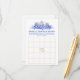 Este jogo é um sucesso para o seu chá. Os hóspedes escrevem em itens que pensam que você receberá e os riscará enquanto você abre seus presentes. O design apresenta um buquê floral azul e branco com um conjunto de chá na borda superior. A praça livre tem uma aliança de casamento.