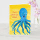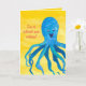 Um feliz cartão de cumprimentos de aniversário divertido com um polvo alegre pintado com vários tons de aquarela azul em um fundo amarelo brilhante de lavagem com aquarela. Você pode editar o texto para ajustado das suas necessidades.