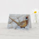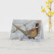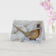 Placa de faisão com anel. De longe os pássaros mais bonitos do planalto, o faisão com pescoço de anel masculino quase brilha nesse fundo de neve. Os dourados e castanhais sobre o corpo contrastam lindamente com o verde vermelho, branco e iridescente da cabeça.