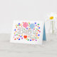 A Horizontal 5"x7", Folded Greeting Card, with a Drawing/Design, of the word Baby, in a Lighter Gray, With a Pink and light Blue Balloon, Some Colorful Confetti and a Red Heart = (Drawing/Design by P.J.M.) on the Front of it. =with the background removed.