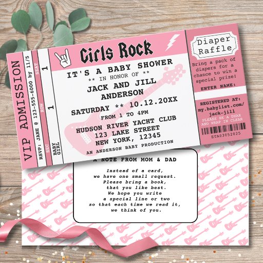 Prepare-se para dar as boas-vindas a sua estrela-fogueira com este Convite para Chás de fraldas do Girls Rock Concert! Projetado para parecer um concerto exclusivo, este convite define a palco para uma celebração que é cheio de diversão, talento e todas as vibrações VIP. Com cores audaciosas, fontes de na moda e detalhes com temas concertados, é perfeito para as mães que estão prontas para agitar a paternidade no estilo.