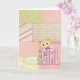 Parabéns de menina com padrão de colcha e boneca fofa em pinks e cores verdes.