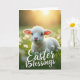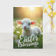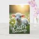 This card shows a baby lamb resting low in spring grass, with small white daisies scattered around like little companions 🌷. Warm golden sunlight pours from above, forming a soft halo that makes the lamb’s fleece glow and gives its wide eyes a tender, friendly look. The lamb’s pink nose and the thin edges of its ears catch the light, adding a gentle blush that feels like a quiet moment shared with someone close. Behind it, the background fades into a blurry field of light spots, keeping attention on the lamb and the flowers in front. Across the lower part of the design, the words “Easter Blessings” appear in white, flowing lettering that sits neatly over the green grass. The white petals and yellow centers of the daisies frame the lamb, as if they’re leaning in to keep it company 🐇. The scene uses fresh greens, soft whites, and honey-gold highlights, with the text set low and centered against the grass. Tiny white daisies dot the foreground while the sunlit bokeh circles shimmer in the distance.