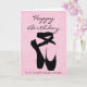 Feliz cartão de aniversário para um dançarino balé. Uma ilustração da silhueta de um par de calçados/chinelos balés pretos que se posam nas pontas dos dedos, conhecidos como pontas de ponta, nos dançarinos de balés clássicos e contemporâneos. O cartão de dentro de mensagem pode ser personalizado se você desejar.