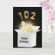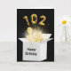 Balões dourados e feixes de luz cintilantes brilham em uma caixa branca sobre fundo preto para o aniversário de 102 anos