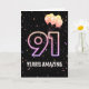 Balões de festa e confete sobre fundo negro com o neon número 91 para um aniversário de 91ruas.