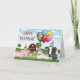A ilustração original de desenho animado de Destei de animais de fazenda que vestem chapéus de aniversário coloridos e possuem balões de aniversário. Há um porco rosa, uma ovelha e uma vaca negra e branca. A vaca está segurando balões coloridos de aniversário em sua boca. No verso há um celeiro vermelho e algumas árvores colocadas em colinas verdes de pastagem. Há duas galinhas na frente do celeiro também. O céu é azul com algumas nuvens. Há também uma área de texto personalizável que agora lê: "Parabéns" em letra vermelha.