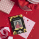 Belo cartão de aniversário com foto, balões e presentes em preto e ouro