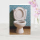 Uma sanita branca é posicionada contra uma parede com papel de parede azul e padronizado com ouro, com chão ladrilhado de cor castanho-bronca, complementando o estilo retrô da decoração do banheiro
