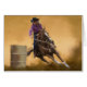 Uma vaqueira corre ao redor dos barris em um evento de competição de rodeio. Rendido em pastéis pela artista prêmio Kathie Miller.