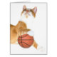 O gato-do-mato-laranja-branco segura-se no basquete enquanto olha para o cartão de saudação de fotos da cesta