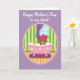 This greeting card features a sweet digital illustration inside a scalloped oval frame on a soft lavender background. In the center, a cute brown, human-like little creature with rounded ears and deep dark eyes peeks up from a pink bathtub dotted with lighter spots, wearing a cozy pink knit cap as if enjoying a gentle, friendly moment ❤️. Fluffy bubbles rise around it, and a small yellow bath toy floats nearby, adding a light, affectionate touch. Behind the tub, the bathroom wall is filled with vertical lime and pale green stripes, giving the scene a cheerful, cozy setting. A window with rich purple curtains opens to a bright view, while a warm wood floor sits below to ground the pastel scene. Near the top of the design, a short message appears in white lettering, centered above the oval image and standing out clearly against the lavender space. Tiny white sparkles and a small golden star twinkle among the bubbles 🌼.